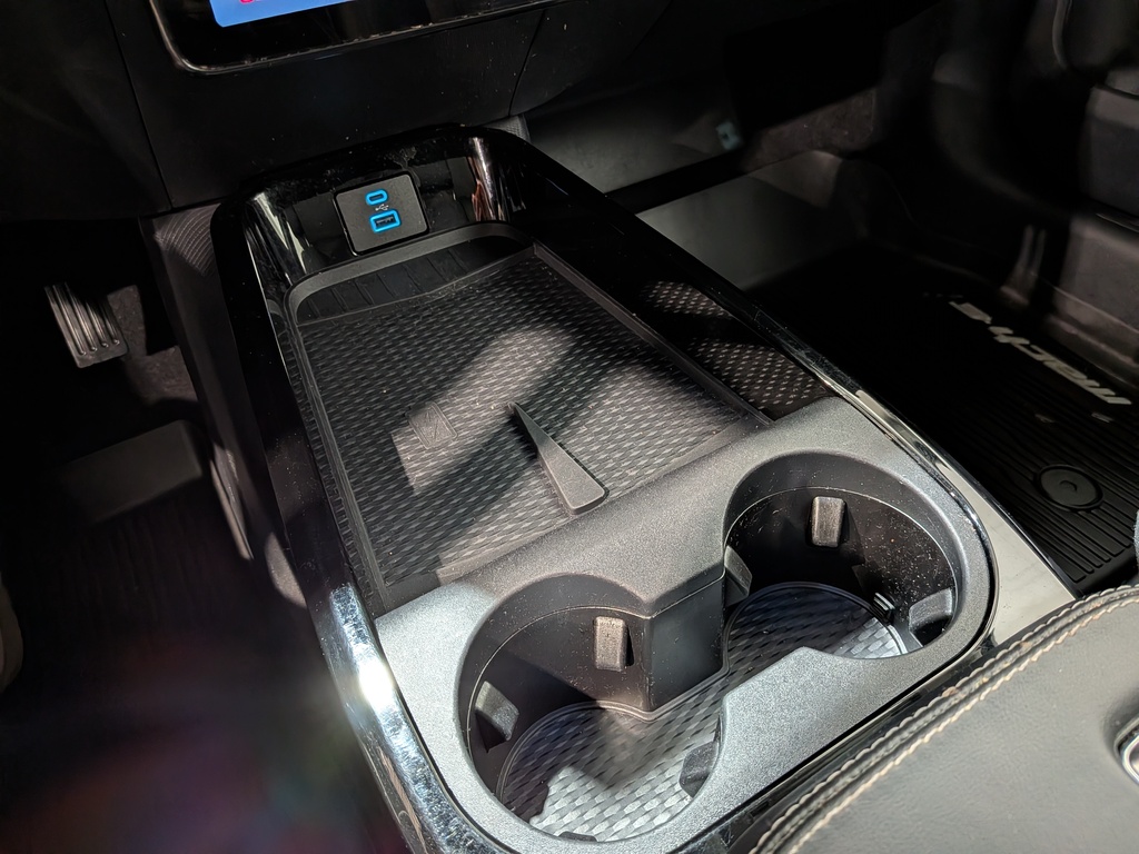 console au plancher pleine grandeur avec compartiment de rangement couvert, miniconsole au pavillon avec compartiment de rangement et 2 prises de courant de 12 v c.c.