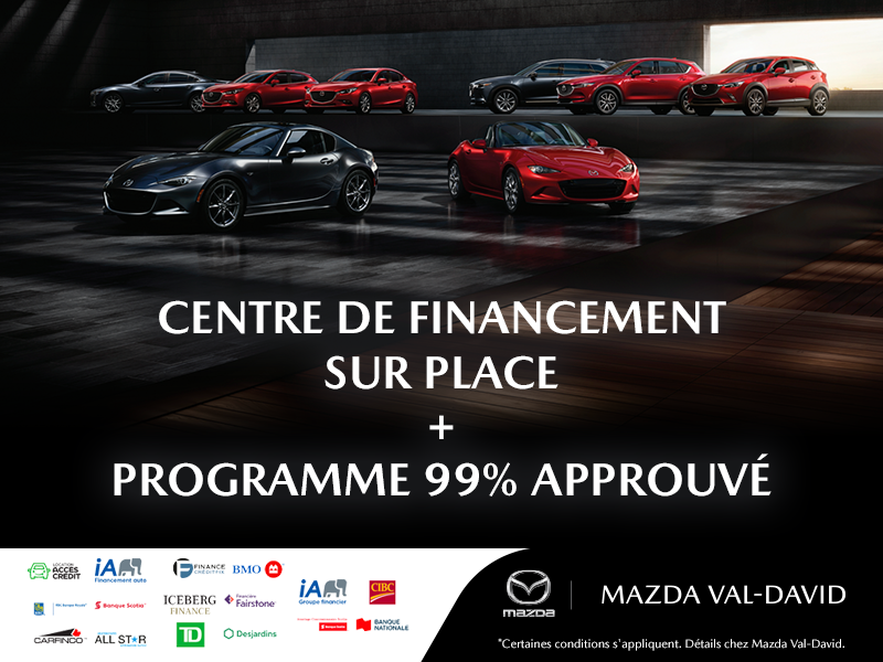 Aucuns frais surprise supplémentaires à la livraison. Nous sommes ouvert 6 jours/5 soirs par semaine. Possibilité d'achat en ligne ou en concession (processus rapide, facile et sécuritaire). Nous trouverons le financement le plus avantageux pour vous parmi nos 17 institutions financières partenaires. Programmes approuvés à 99,9%*, 0$* comptant. Obtenez les meilleurs taux sur le marché, grâce à notre volume de prêt élevé. On reprend votre véhicule en échange et on vous offre une valeur supérieure au marché actuel, peu importe la marque, le modèle ou l'année (auto-camion-VR-motoneige-VTT). Magasinez votre prochain véhicule Mazda directement chez Mazda Val-David, la nouvelle référence dans les Laurentides. Récipiendaire du trophée meilleur prix hebdo.net 2020-2021. Réservez votre véhicule ou obtenez une pré-approbation* en téléphonant au 1 (844) 932-2066